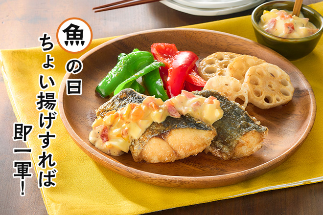 揚げ焼きしたさわらに、福神漬け入りのタルタルソースをのせた南蛮風レシピ。アクセントのある食感と濃厚ソースで、ご飯が進む一品に。