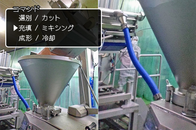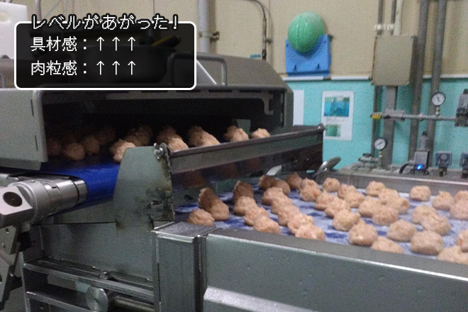 純輝鶏(国産)肉だんごクン、味方が現れたよ! キミたちをもっとおいしくという思いに製造委託先の方が賛同して、新型成型機を導入してくれたんだ。