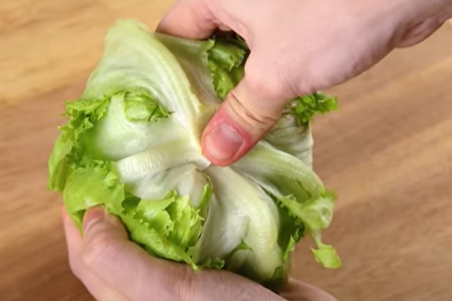 レタスの芯を親指で押し込み、くり抜きます。