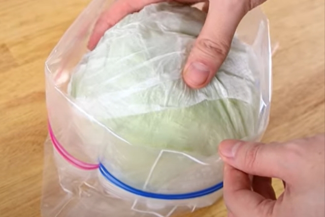濡らしたキッチンペーパーでレタスを包み、ジッパーバックに入れて冷蔵庫へ。傷みにくく、シャキシャキ感も長持ち。