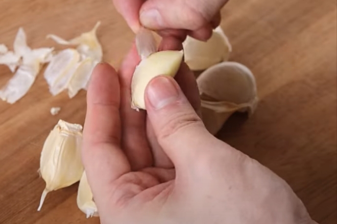 にんにくをバラバラにして、薄皮を剥きます。