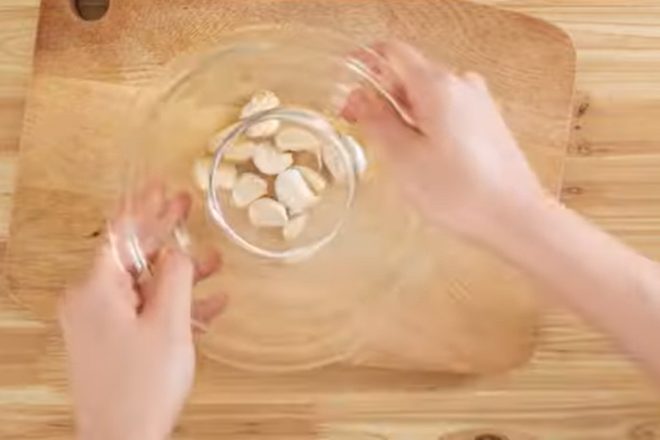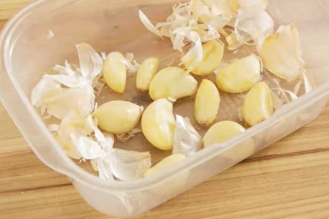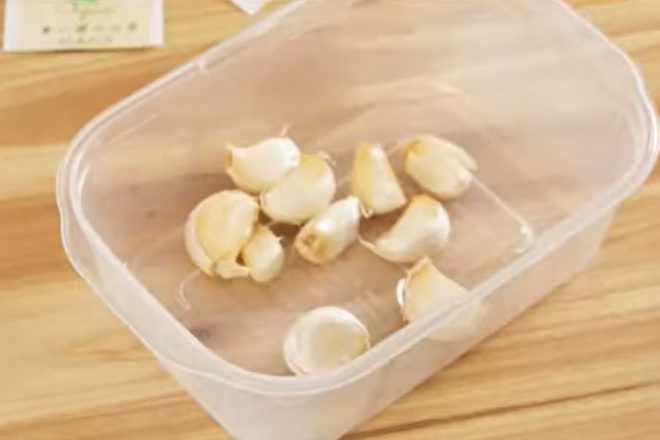 にんにくを食品保存容器に入れ、蓋をしてシャカシャカと振ります。