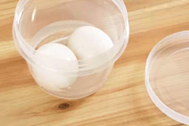 粗熱を取った殻付きゆで卵と水を食品保存容器に入れます。