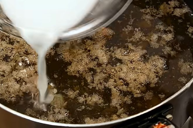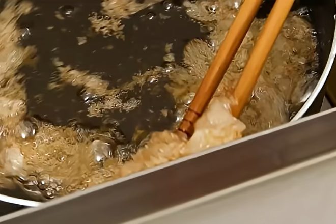 鍋に水溶き片栗粉を注ぎ入れ、箸でかき混ぜながら揚げていきましょう。