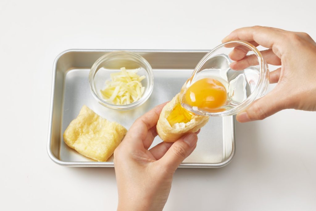 ②小揚げは開きやすいように菜箸を転がしてから半分に切る。袋状に開き熱湯をかけて油抜きをする。水気を切って粗熱が取れたら、口を開いてミックスチーズを底に敷き詰め、卵を入れる。