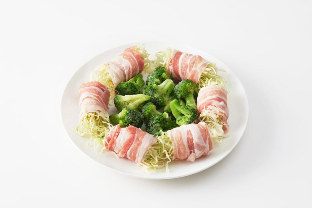 ②耐熱皿に①の巻き終わりが下になるように並べ、中央にブロッコリーを重ならないように置く。耐熱皿にふんわりとラップをかけて電子レンジ(600w)で4分程度加熱する。