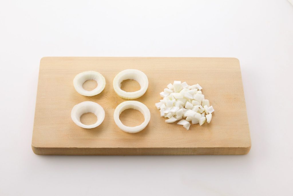 ①玉ねぎは4等分の輪切りにする。外側2~3層を残し、中心部をくり抜く。