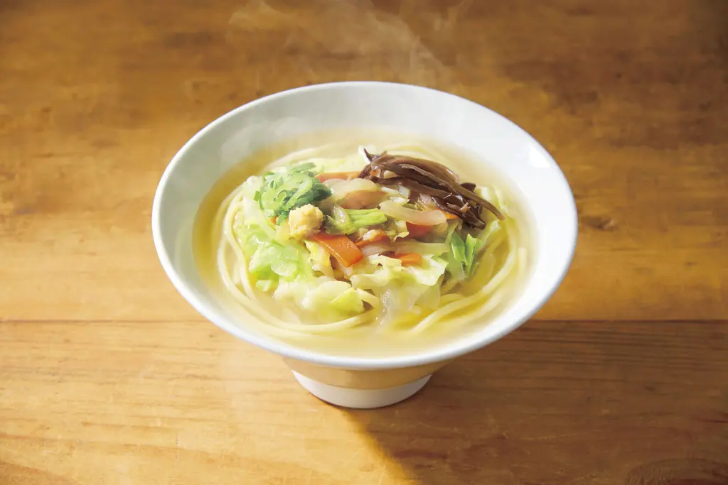 キャベツ・玉葱・にんじん・青ねぎの4種野菜と太麺のもっちり食感がおいしい塩ベースのスープ。