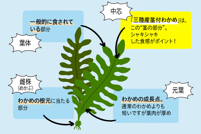 わかめは春に収穫するもの。「三陸産茎付わかめ」はしっかりとした厚みがあり、食感が良いんです。