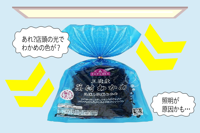 わかめは、鮮やかな緑色が特徴です。しかし店頭で照明が当たり続けると、緑色があせ、茶色や白っぽく変色してしまうことがあります。いわゆる「蛍光灯焼け」「日焼け」と呼ばれる状態です。